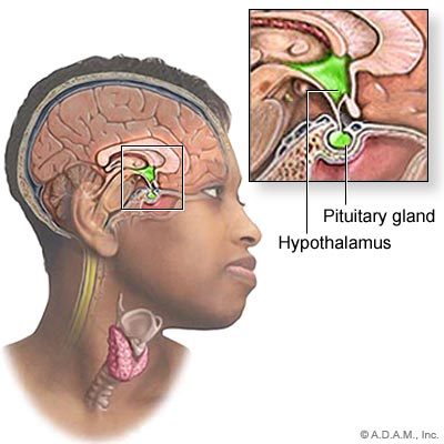 The Pituitary is a gland is an endocrine gland about the size of a pea and weighs less than 0.02oz. It is a protrusion off of the bottom of the hypothalamus at the base of the brain.