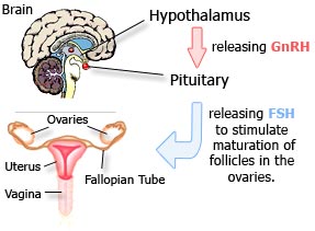 Follicle Stimulating Hormone (FSH): is stimulated into production at the beginning of the cycle, because of the decrease in the ovarian hormones, estrogen and progesterone production at the end of the previous cycle. FSH stimulates several of the most sensitive follicles in the ovary to begin growing.