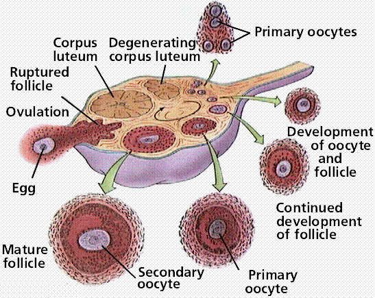 Ovaries: Under the influence of FSH and LH the ova mature and are released from a cyst like structure called the follicle. Usually only one follicle reaches maturity and releases an ovum at ovulation. Following ovulation, the ruptured follicle collapses and becomes the corpus luteum. At birth, the ovaries contain about 500,000 eggs but during a womans reproductive life only about 500 ova will ever come to maturity.